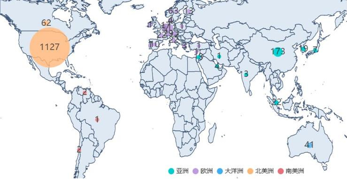 根据学者当前就职机构地理位置进行划分,2000名学者中有1128名来自美国,占比61.4%;尽管中国排名所有国家中的第二名,但也仅有173名,占比9.4%;其次是德国111名。