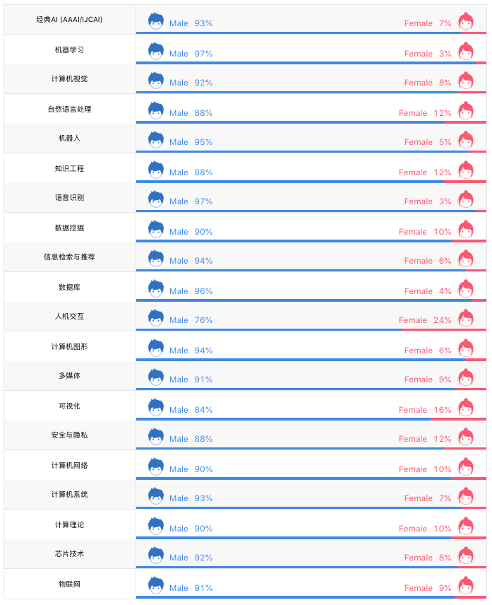 AI 2000报告也对所有上榜学者性别做出统计。男性在各领域中均占多数,共 1661人;女性学者稀少,共 176 人。其中,机器学习领域的男性学者比例最高,达 97%;人机交互领域的女性学者比例最高,但也只占该领域的 24%。