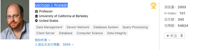 Michael J. Franklin 排名第一,其学生、华人学者Reynold Xin也位列第 9 名。在数据库领域,清华大学的李国良教授排名第 24 位。
