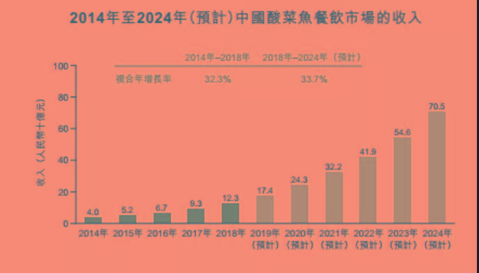 太二幸运地站在了一个风口。2018年中国酸菜鱼市场总收入达123亿,复合年增长率为32.3%。预计今后将以33.7%的复合年增长率增长,到2024年市场规模达到705亿元。