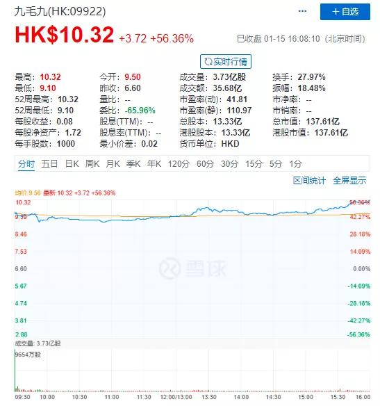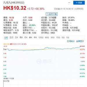 今天(1月15日),“太二”酸菜鱼母公司九毛九在香港上市。开盘后涨56.36%,目前股价报10.32港元,市值137亿港元。