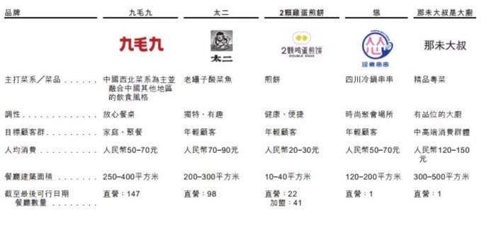 它的餐厅一般位于购物商场。九毛九和太二是其主力品牌,两者收入占其总收入的98%以上。