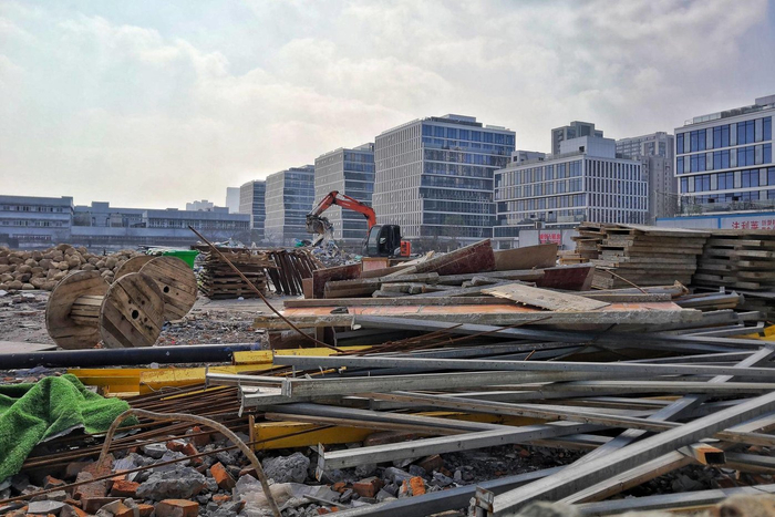 建设二路上,被拆除的华越家具厂房及旁边的信息港六期项目。
