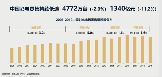 国内电视市场的竞争已经来到了存量竞争的阶段,奥维云网数据显示,中国彩电销售量4772万台同比下降2.0%,总销售额1340亿元同比下降11.2%;与此同时,产品平均单价创下了十年内新低的2809元。