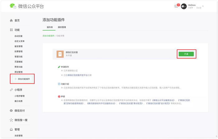 Step1:在公众平台后台,开通“微信红包封面”功能插件。开通成功后,公众平台后台的编辑器内会增加“红包封面”组件按钮。