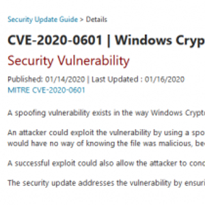 在1月14日的补丁星期二活动中,微软修复了存在于所有受支持Windows系统的严重高危安全漏洞。此漏洞由美国国家安全局(NSA)发现并披露给了Microsoft , 漏洞编号为CVE-2020-0601。
