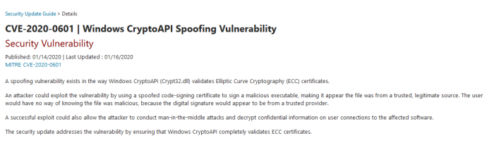 在最新公告中,微软承认CVE-2020-0601带来的高危影响,并表示Windows CryptoAPI(Crypt32.dll)中用于验证椭圆曲线密码学(ECC)证书的方式中存在一个欺骗漏洞。黑客利用该漏洞可以签署任意恶意可执行文件,将其伪装成为受信任的合法来源。微软表示:“成功利用此漏洞还可以使攻击者进行中间人攻击并解密机密信息。用户与受影响软件的连接。”