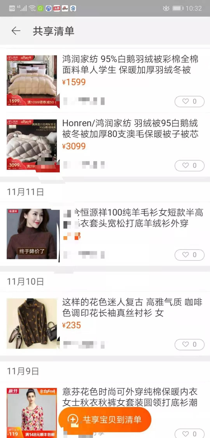 这一年里,她分享的链接涵盖四季,春天有丝巾、夏天则是各种真丝衬衫,秋天开始选棉服,冬天要羽绒蚕丝被。即使晚上12点,也不能阻挡她逛淘宝的脚步。