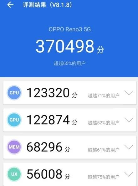 另外,这款芯片不仅支持双模5G,性能也相当不错,在安兔兔上,Reno3跑分达到了37万,性能与骁龙845、麒麟980相仿,能够满帧运行《王者荣耀》、《QQ飞车》等现在主流的手机游戏。