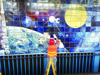 曲欣老师介绍,建国门站两幅巨型瓷砖壁画《中国天文史》和《四大发明》一共用了10976块瓷片。《中国天文史》长62.25米,高3米。作品内容包括从古至今的中国古代天文发现与发明成果以及从古代神话故事到现代科技展望等三大板块内容。《四大发明》作品全长60米,高3米,内容包括了发明火药、指南针、造纸、活字印刷这四项中国古代最著名的科技贡献。两幅壁画均采用彩色瓷砖拼贴而成。