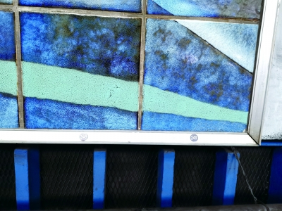 修缮过程中,第一步要充分理解两幅壁画的烧制工艺,根据相关资料及实际了解,进行样品烧制,保证材料及烧制工艺与原壁画一致;第二步是专业的壁画陶瓷工艺美术师团队充分理解作者创造意图后,进行缺失部分补意,修复部分壁画图形及色泽要保证与原有部分浑然一体;第三步是依照补意资料,进行基板临摹,最后进行烧制,同一片壁画需要烧制几组,选择最优一组进行现场安装;第四步是最优壁画到现场后,将壁画放置在安装区域比对,符合要求的进行安装,不符合部分与陶瓷工艺美术师沟通,重新再进行烧制,直到符合要求为止。