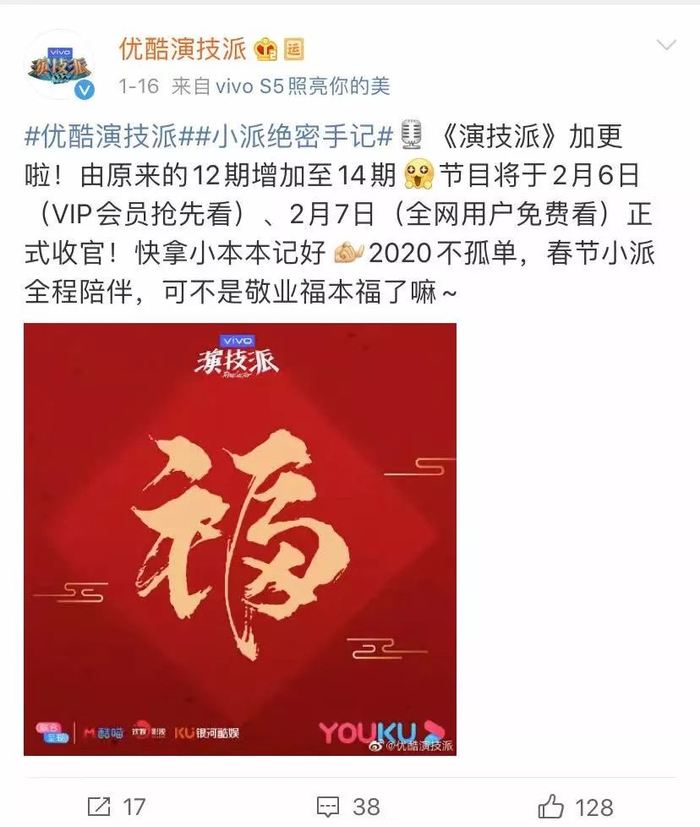 优酷的“春节综艺套餐”虽不及剧集那般品类丰富,但也具备较强的吸引力。优酷自制的年轻演员片场生存真人秀节目《演技派》,近期官宣由原来的12期增加至14期,在春节档期间持续播出。