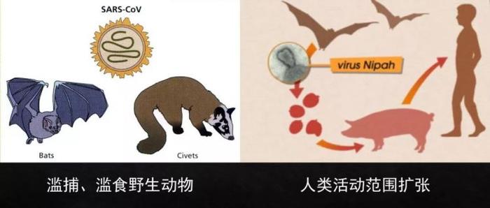 我们看一下SARS是怎么来的。SARS的源头是蝙蝠不假,但是它发展的舞台是广东野生动物市场和餐馆。如果没有我们滥用果子狸,食用果子狸,那么病毒从蝙蝠到果子狸再到人的传播链就不会发生,当年的SARS就不会爆发。