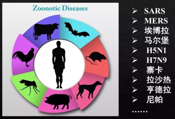 大家会发现近些年来世界各地出现的新发传染病越来越频繁,除了SARS以及刚才提到的亨德拉、尼帕病毒以外,还有各位比较熟悉的H7N9禽流感、埃博拉、中东呼吸综合征等等。这些新发传染病都有一个特点,它们都和动物有关。研究人员做过统计,有超过70%的新发传染病来源于动物。