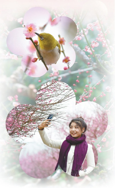 图①:福建福州,盛开的梅树上,一只绣眼鸟在寻食花蜜。