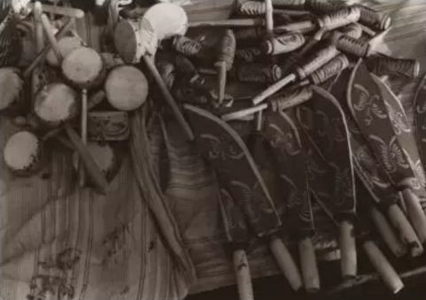 ▲ 白云观庙会上的玩具花楞棒、拨浪鼓和木刀,通称为耍货
