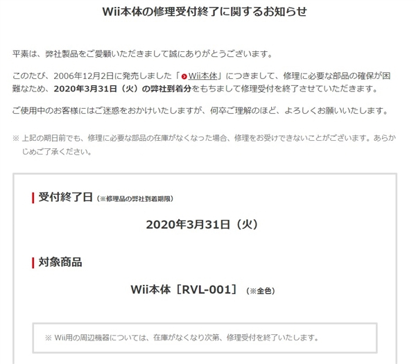 1月27日,任天堂官网宣布,将于2020年3月31日正式关闭对Wii主机的维修服务。采取此举的原因是因为该公司早已不在生产Wii主机维修所需的零部件,同时库存的零件也即将消耗殆尽。