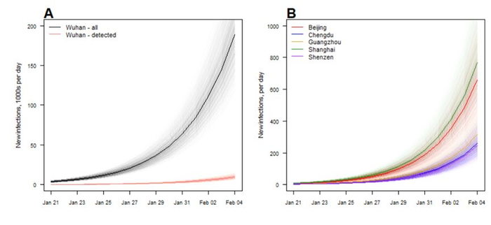 谈到这么远,那么这次发现的2019新冠状病毒传播力现在可以根据目前的流行学数据获得了吗?还真有,早在1月17日,武汉疫情还没有引起广泛关注的时候,世界卫生组织传染病建模合作中心(WHO Collaborating Centre for Infectious Disease Modelling)、英国帝国理工学院MRC全球传染病分析中心(MRC Centre for Global Infectious Disease Analysis)发表报告称,他们推断,截至2020年1月12日,武汉新型冠状病毒感染患者预计达1723例(预测区间427-4471),数量远大于当时通报的病例数量。但是今天(1月27日)公布的湖北病例数是1423,考虑到还有疑似病人未被筛查出来,增额数据还是有值得参考的价值的。这种推测病例数的数学模型至少有一定的实际估算作用。