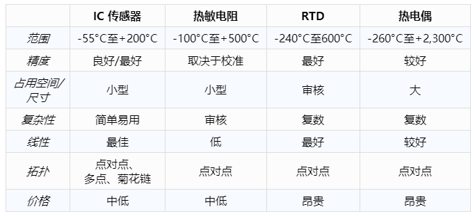 工业中常见的温度传感器技术包括集成电路 (IC) 传感器、热敏电阻、RTD 和热电偶。表 1 比较了在为设计挑战评选适合的技术时参考的主要特性。