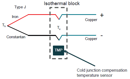 图 4.带有冷端补偿 (CJC) 温度传感器的热电偶。