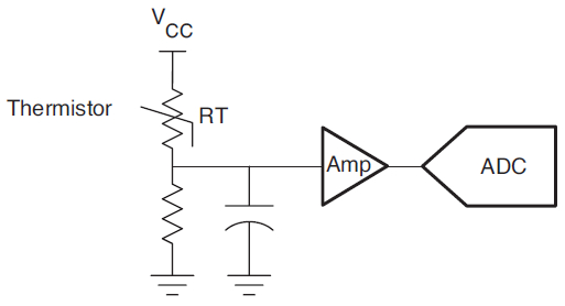 图 2 显示了典型的热敏电阻实现方案。通常很难确定热敏电阻的真实系统精度。NTC 系统误差的影响因素包括NTC 容差、偏置电阻器(易受温漂影响)、ADC(可能导致量化误差)、NTC 固有的线性化误差以及基准电压。