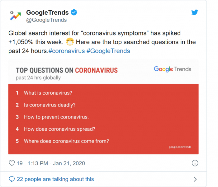 正如谷歌趋势在Twitter上所披露的,跟新型冠状病毒相关的搜索量在过去几周达到顶峰。这是意料之中的,但其中却还有一个既好笑又有点麻烦的问题,即许多搜索该病毒信息的人似乎认为这种病毒跟科罗娜(Corona)啤酒有关。