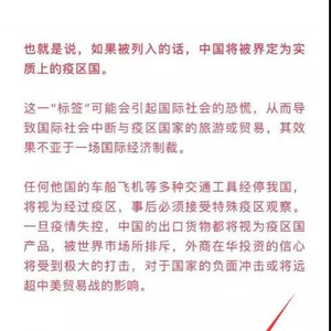 此前在国内社交媒体有文章称,一旦宣布新冠病毒疫情为PHEIC,则意味着中国会被列为“疫区国”。一旦成为“疫区国”,可能导致与国际社会旅游、贸易的中断,其威慑力不亚于一场国际经济制裁。
