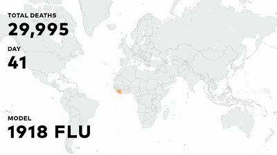 事实上,让我们来看看一个病毒由空气传染的模型,像1918年的西班牙流感。疫情有可能像这样发展:病毒会以很快的速度向全世界蔓延。你可以看到全球有三千万人死于这个疾病。这就是个很严重的问题。我们绝不应该忽视。