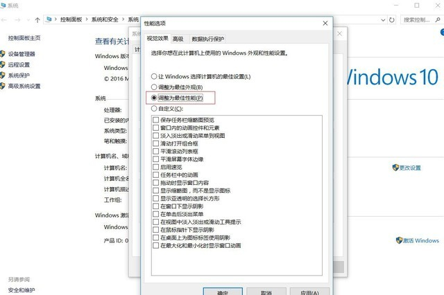 如果想再全面一点可以点击“性能”项中的设置进入性能选线,点击“调整为最佳性能”,因为开启系统的特效不但会影响速度,占用资源,对于开机启动也会有一定的影响。