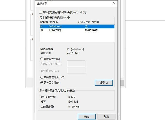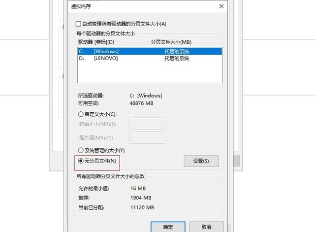 重启之后我们依然按照上述的步骤来到虚拟内存的界面,点击C盘盘符,随后在下方选择“无分页文件”进行设置,再点击确定重启即可。
