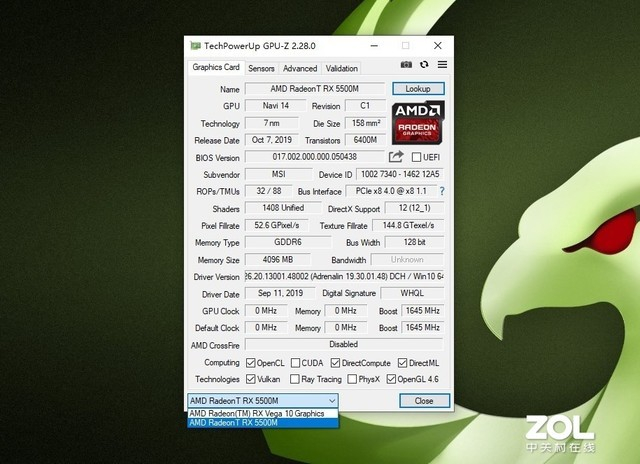 Radeon RX 5500M独立显卡采用RDNA架构打造,拥有1408个流处理器,128bit显存位宽,4GB GDDR6显存,峰值单精度计算性能4.63TFLOPs,游戏频率可至1448MHz,加速频率高达1645MHz,支持4K H.264编解码,支持H.265/HEVC编解码。