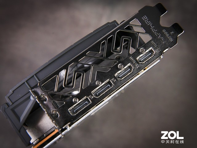 外观上,蓝宝石RX 5700 XT 8G D6 超白金极光特别版在显卡正面护罩上黑色部分有蜂窝状的凹线,搭配上正面护罩上两条银色装饰条非常漂亮,看似简洁但质感十足。风扇位ARGB双滚珠风扇,两侧两个10cm直接的风扇,而中间反装的风扇直径为9cm,通过小中间风扇反转的放松降低风扇间乱流让风扇的气流效率更高,达到提升散热的效果。