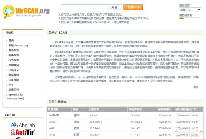 ViruSCAN的使用很简单。它支持简体中文,上传文件后点击“扫描一下”即可。ViruSCAN支持上传各类文件,但也存在一些限制,例如文件大小不能大雨20M,如果上传的是压缩包,内含文件不得超过20个。