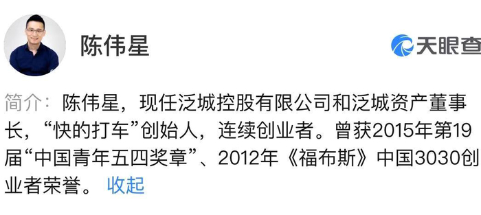 公开资料显示,陈伟星现任泛城控股和泛城资产董事长,系原快的打车创始人,2012年被授予杭州唯一“全国就业创业优秀个人”,2015年曾获中国青年五四奖章。