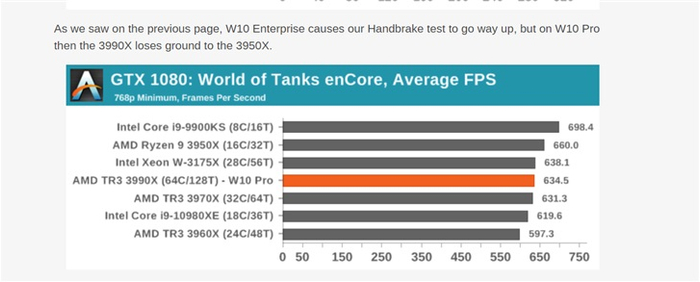 在游戏测试中,主频更高的i9-9900K(8C16T)仍然是王者,但是64核的3990X表现也是高于32核的3970X和英特尔的18核的i9-10980X。