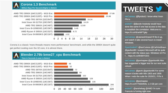 AMD 线程撕裂者3990X 虽然达到了64核,但其范畴仍是HEDT处理器,因此AnandTech用英特尔目前最强的i9-10980XE(18C36T)和至强W-3175X进行了对比。在Blender在内多个测试项目中,大多数项目都是3990X 领先,而且Windows 10 企业版比专业版更能发挥出它的性能。