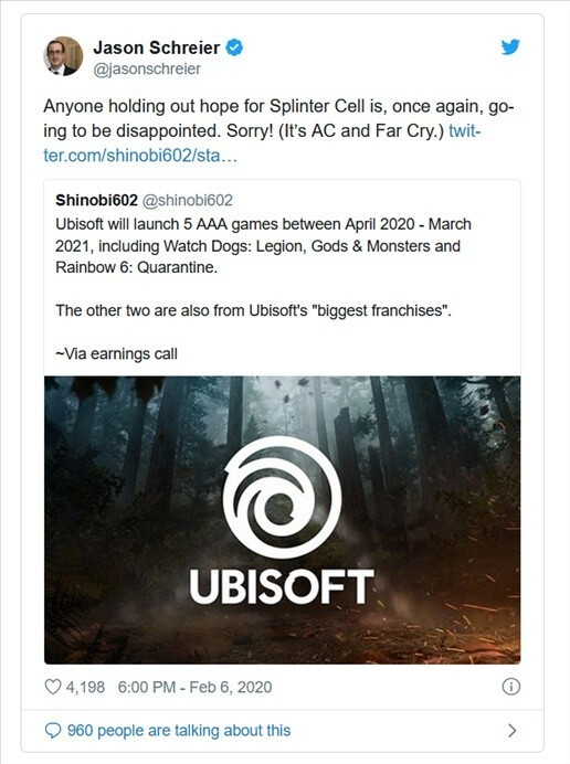 目前育碧公司正计划在2020年至2021年初的大部分时间里推出游戏。据Twitter用户称,育碧将推出三款AAA游戏,包括《看门狗:军团》、《众神与怪兽》和《彩虹六号:封锁》,预计在2020年10月至2020年12月之间。而2021年初可能会发布新的《刺客信条》系列和《孤岛惊魂》系列。