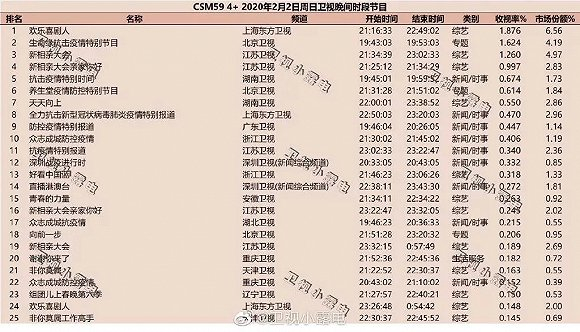 上周六,由于《快乐大本营》《漫游记》《了不起的长城》等节目暂停播出,除防疫相关节目外,没有综艺节目收视率破1。周日(2月2日)也仅有《欢乐喜剧人》《新相亲大会》两档节目破1,整体收视率较往年春节档受挫。