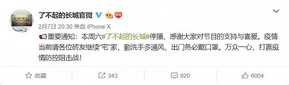 东方卫视1月30日宣布暂时停播了周六晚黄金时段播出的明星户外家庭探访美食节目《亲爱的,来吃饭》。北京卫视《了不起的长城》上周由于春晚已经停播,本周因为疫情继续停播。