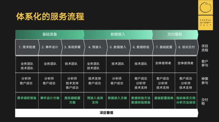 我们将客户服务流程切分的非常细,从开始的业务数据,到整个数据介入,再到后边如何去培训用户。这些环节里会涉及到什么角色,客户方面需要配合什么资源,都会在流程里进行清晰地切分。客户跟我们合作的时候,就会非常放心。我们肯定能把你服务好了。