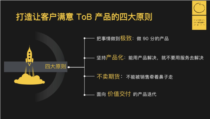目前大量项目制的ToB公司,都是在卖期货。客户想要一个什么东西,销售说能做,没问题,就先把单子签下来。之后回到公司,叫技术人员,按照交付时间赶紧做。这样整个团队就被拴住了,被销售牵着鼻子走。大家做了很多定制化的功能,单子也能卖钱。但是你就失去了规模化的可能性。