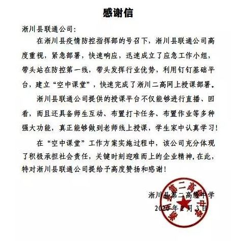 在抗击疫情期间,淅川联通积极履行社会责任,扛起央企担当,针对高三毕业班的教学问题,利用钉钉线上教学优势免费为二高等7所学校安装了钉钉线上教育平台,供学生在家上课、师生在线沟通。同学们可以利用钉钉线上课堂完成学业,解决“停课不停学”的问题,截止2月6日,全县采用钉钉直播课堂线上授课的班级已达345个,收听收看直播授课学生人数已达3万余人次,得到了县委县政府、学校、家长和老师的一致好评,为此淅川二高专门致函淅川联通表示感谢。同时,淅川联通还为地方党委政府开通了钉钉会议系统,有力保证了疫情期间各项政令的畅通。