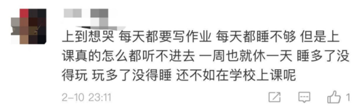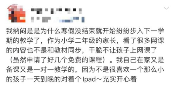 2月4日,就有网友表示,停课不停学已经演变成了提前开学,寒假还没有结束,寒假作业提前收,每天还有额外的作业和学习任务,说好的寒假没了。
