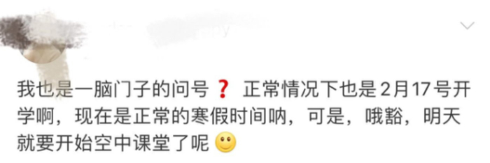 对于提前网络教学,网友表示疑问,正常情况下2月17号才开学,现在是正常假期,可是马上就要开始“空中课堂了”。