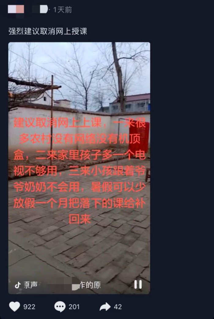 还有建议取消网课的家长表示,一来很多农村没有网络和机顶盒;二来家里孩子多,一个电视根本不够用;三来孩子爷爷奶奶不会使用网络。可以暑假少放假,把剩下的课补回来。