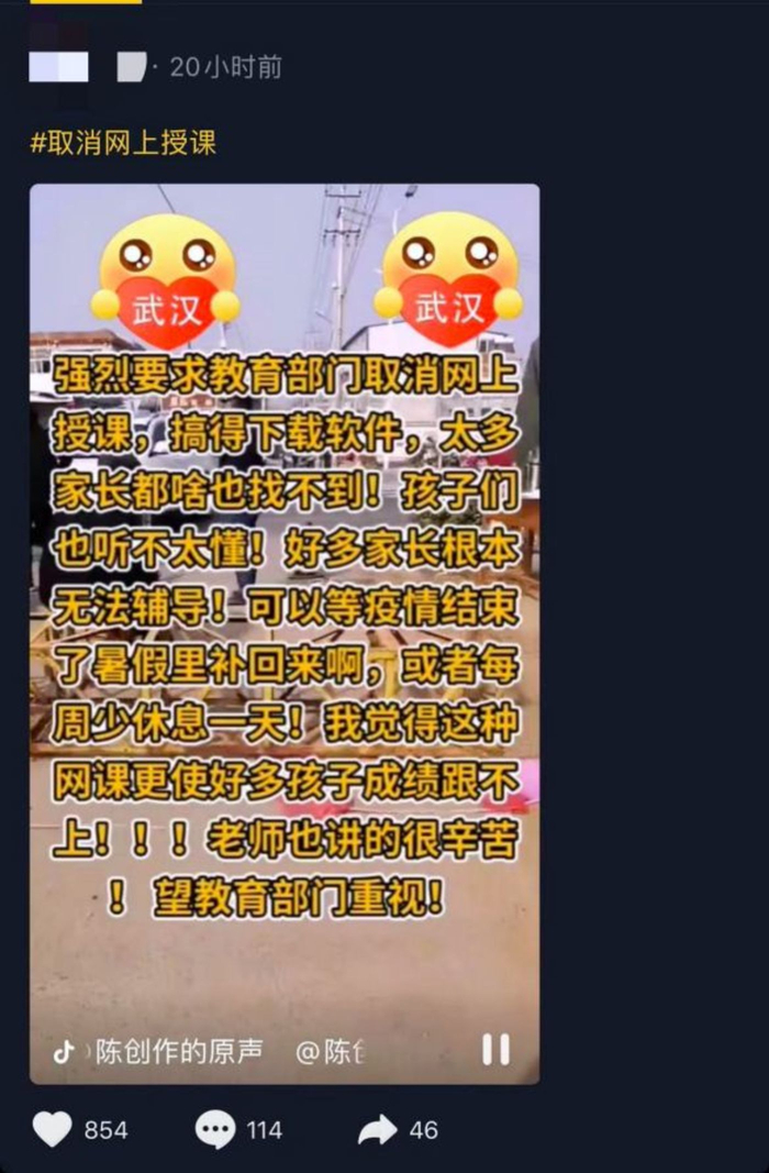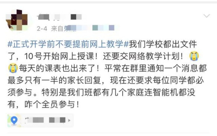 还有网友发文称,学校已经出了文件,10号开始网上授课,还要求提交网络教学计划,每天的课表都已经发出来了,要求每位学生都必须参与,但是班级里有几个家庭没有智能机,不知道怎么达到全员参与。