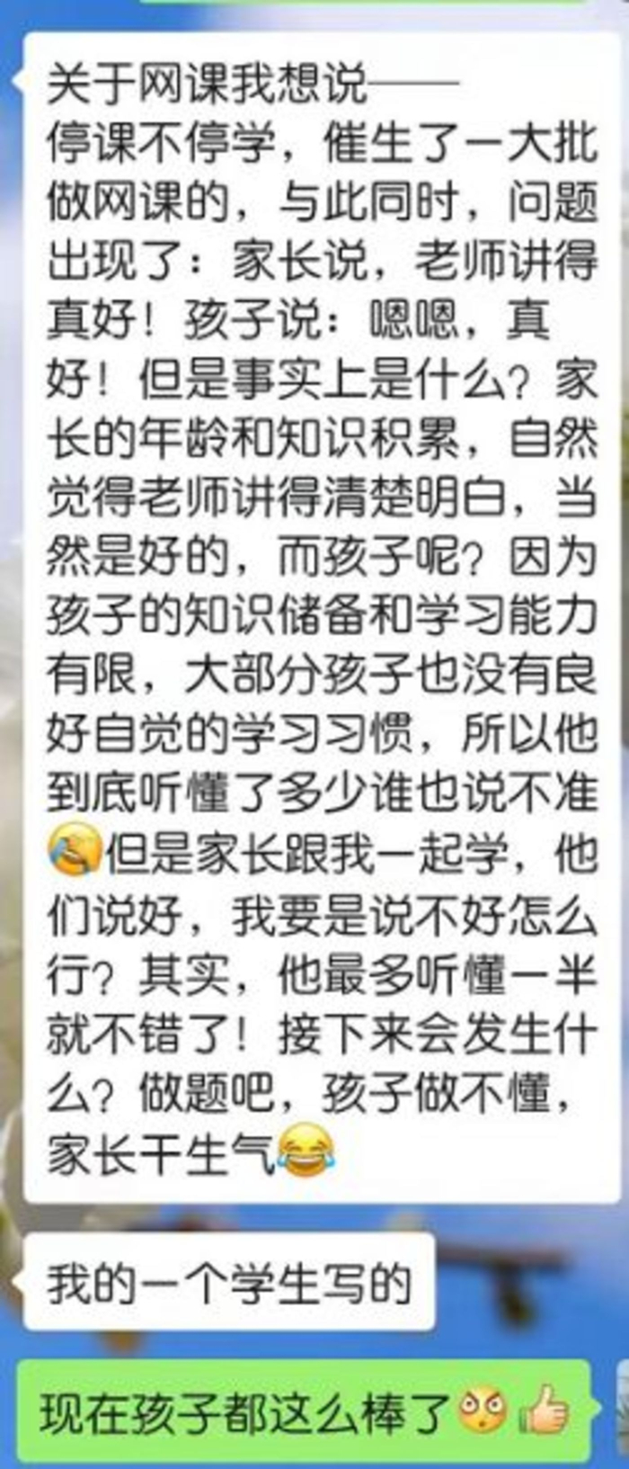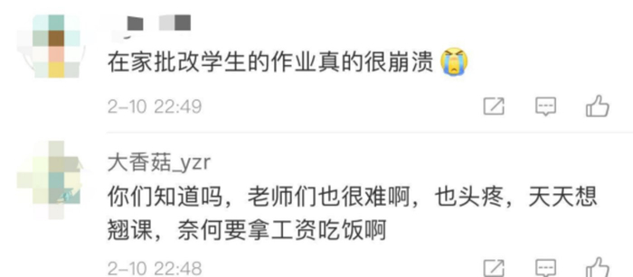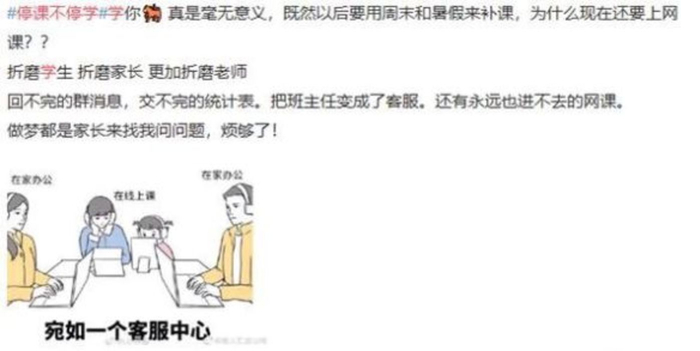 有教师认为网络教学毫无意义,他表示,既然要用周末和暑假来补课,为什么现在还要进行网络教学。每天都是回不完的群消息,交不完的统计表,永远进不去的网课。班主任已经变成了客服,现在做梦都是家长来问问题。
