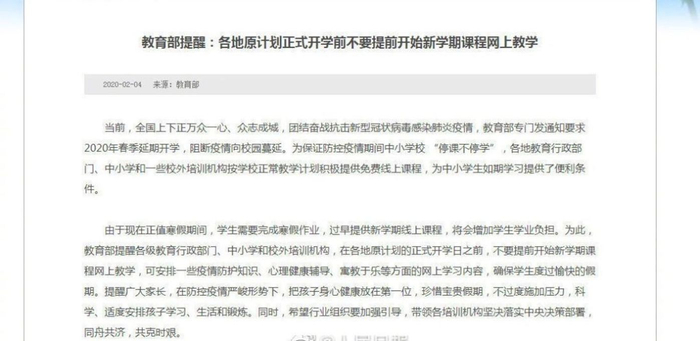 2月4日,教育部发布提醒显示:各级教育行政部门、中小学和校外培训机构,在各地原计划的正式开学日之前,不要提前开始新学期课程网上教学,确保学生度过愉快的假期。