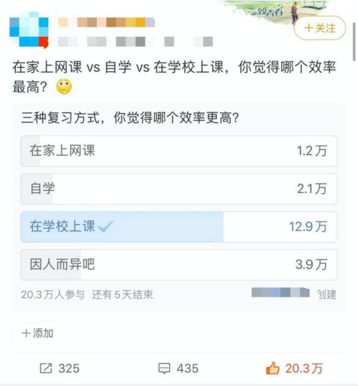 网上也有关于多种学习方式效率高低的投票,大多数人认为在学校上课学习效率最高,而在家上网课的票数最低,很多人宁愿自学也不愿意上网课。