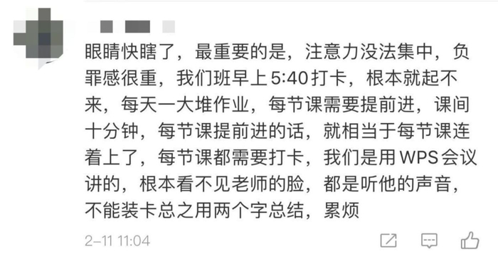 上网课的学生表示,上网课没办法集中注意力,产生了很强的负罪感。班级要求5点40就打卡学习,根本起不来,每天一堆作业,每节课都需要跟进,课间十分钟还需要提前进入下一节课,相当于连着上课。而且上课中根本看不见老师的脸,只能听见老师的声音,又累又烦。